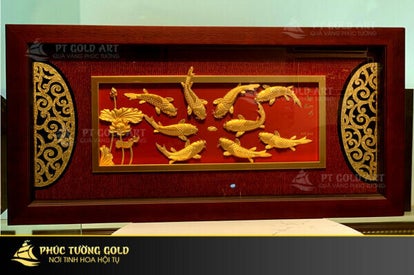 Tranh cá chép dát vàng 24k – hình ảnh cá chép kết hợp với hoa sen tạo nên một tổng thể hài hòa về thẩm mỹ và phong thủy. Đây là món quà được lựa chọn dành tặng sếp, khách hàng, bạn bè. Ngoài ra còn dùng như một vật phẩm trang trí tạo điểm nhấn cho không gian trưng bày.